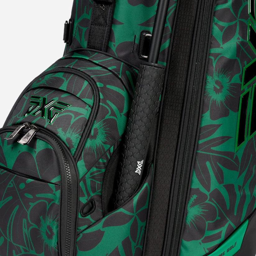Get on island time in no time with our Aloha Hybrid Stand Bag. This festive bag is made from a durable polyurethane outer material and has a six-way top with 14 total pockets. It features a four-point single carry strap, a padded back panel, carbon fiber stand legs and a patented external magnetic putter attachment. It features our latest Aloha print—a hand-drawn design featuring native Hawaiian leaves and flowers—in green and black, ready to bring the fun to your next round.